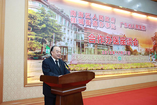 12月27日上午,南海区人民政府、南海区桂城街道办事处与广东省人民医院合作办医座谈会在南海迎宾馆迎宾厅举行。佛山市委常委、南海区委书记黄志豪,广东省医院党委书记耿庆山、副院长袁向东、吴书林,南海区政府副区长冼富兰、佛山市南海区桂城街道党工委书记麦绍强、桂城街道办事处主任岑灼雄及广东省医院相关职能处室处长,南海区有关部门、桂城街道、广东省人民医院南海医院(以下简称“省医南海医院”)等相关领导出席会议,共同见证合作办医补充协议签定仪式。