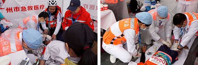 为保障赛事的安全,广州市急救医疗指挥中心抽调了全市最好的医疗力量,多方位“无死角”守护着赛事的安全。广东省人民医院接到任务后,火速组建了现场医疗保障小组和院内危重症急救小组。现场医疗保障小组由3名骑行移动救护员和7名固定点救护员组成。院内危重症救治小组由体外循环科周成斌主任、急诊科胡北副主任等专家组成ECPR快速反应小组。