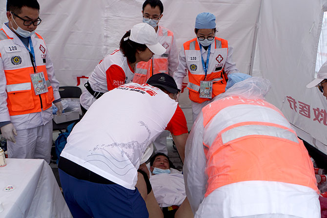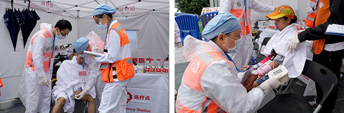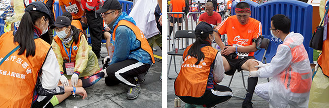 省医医师跑者跑完全程后,不及休息,马上投入我院固定医疗点的协作救治。