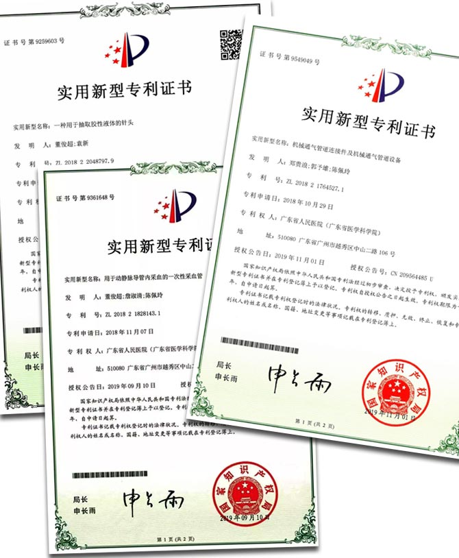 纤维支气管镜检查与治疗是PICU的常规操作技术,然而目前的呼吸机连接器常常因漏气而导致重症患儿难以顺利完成检查及治疗。为解决这一难题,催生了一项实用新型专利“机械通气管道连接件及机械通气管道设备“ (专利号:ZL201821764527.1,郑贵浪、郭予雄、陈佩玲)。针对常规用注射器抽取白蛋白等胶性液体时容易产生气泡及药瓶内少量药液残留的问题,护理团队的另一项实用新型专利“一项用于抽取胶体性液体的针头”(专利号:ZL201822048797.9,董俊超、袁新),使问题迎刃而解。此外,临床上从动静脉导管内采血存在操作程序繁琐,容易导致血液污染,易导致医护人员接触到血液,护理团队再次迎难而上,”用于动静脉导管内采血的一次性采血管“(专利号:ZL201821828143.1,董俊超、詹淑清、陈佩玲)再获国家实用新型专利。