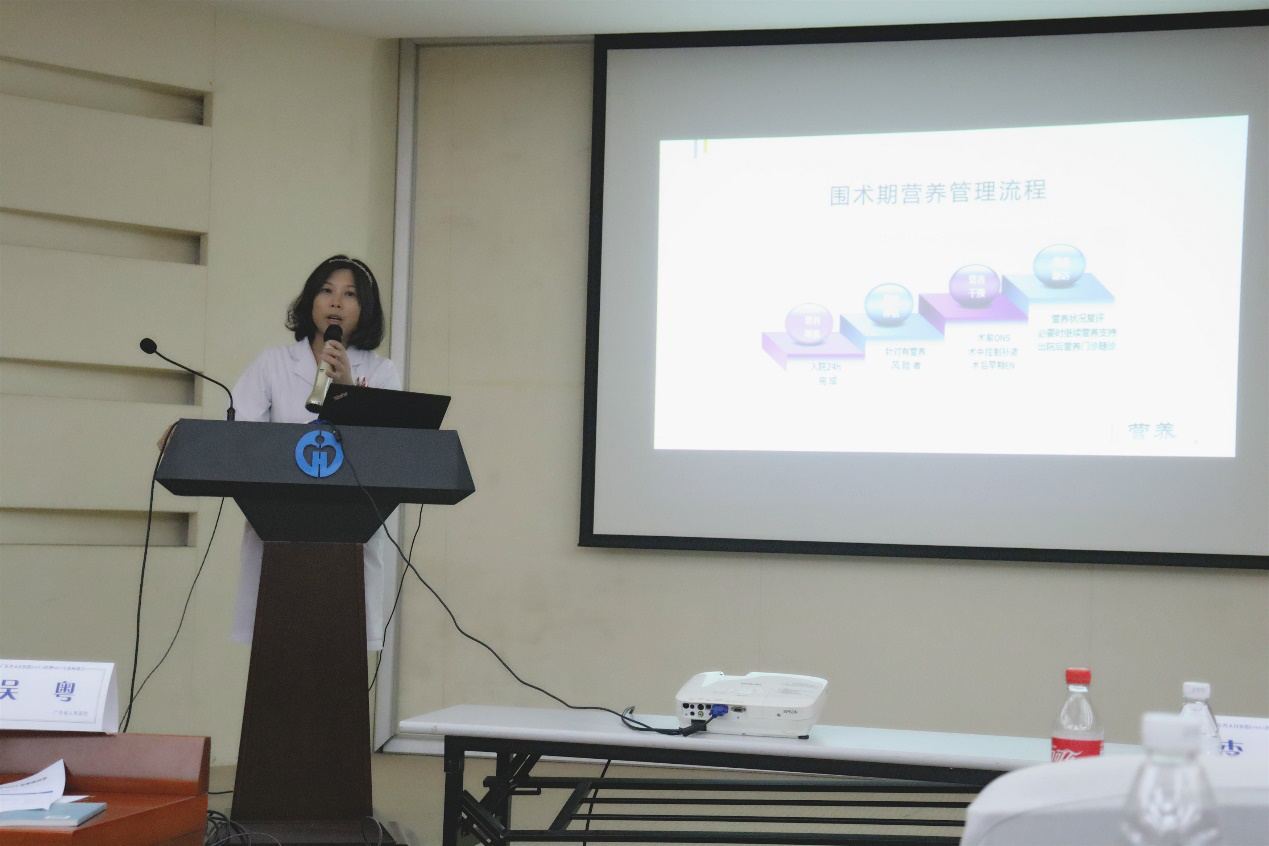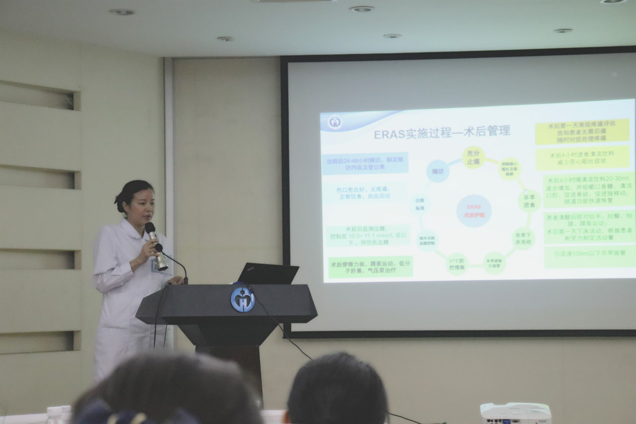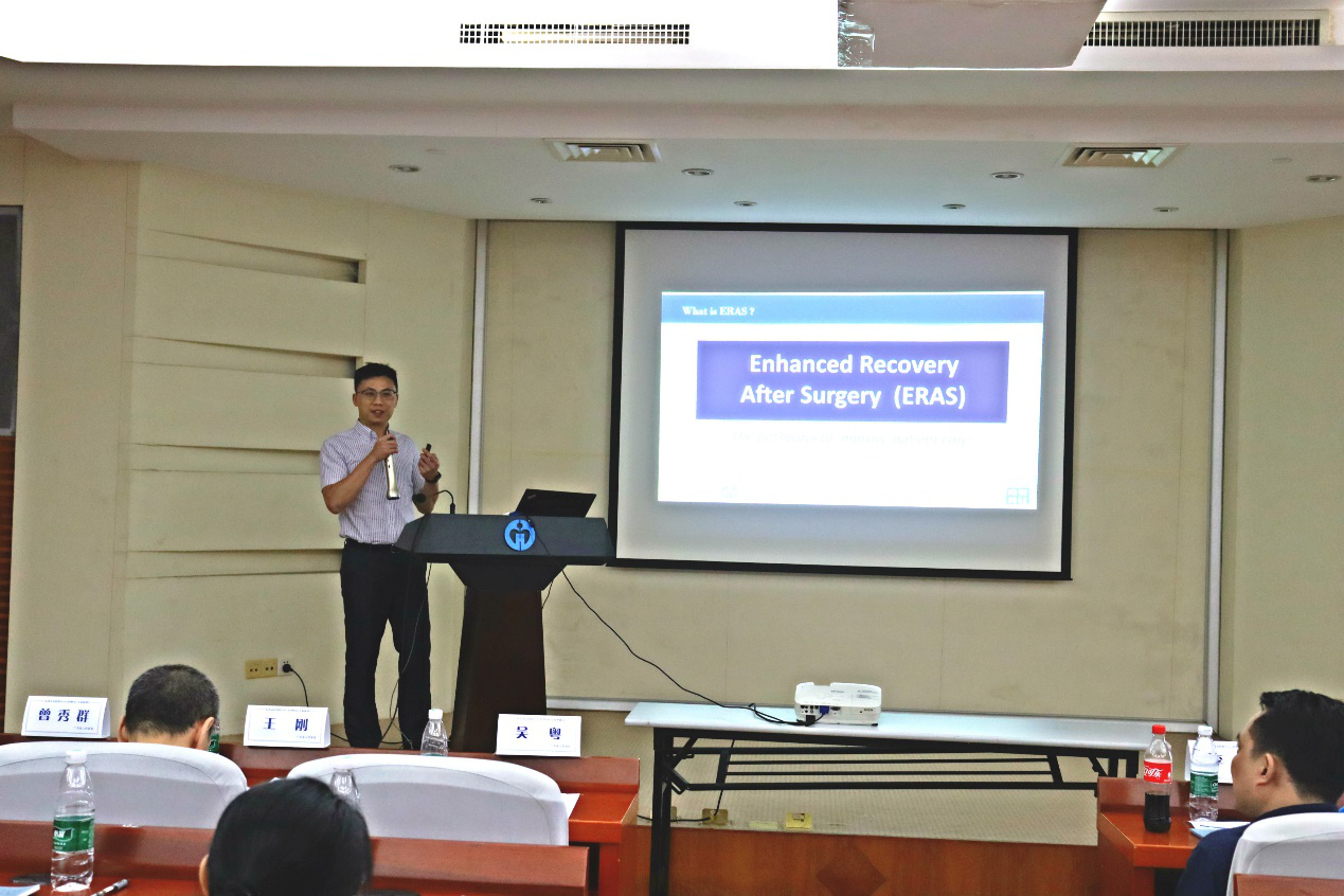 胃肠外科吴德庆副主任医师、麻醉科的刚主任医师、骨科黄帅豪博士、妇产科曾秀群护士长、营养科肖本熙医生分别以题为“籍ERAS之名优化临床诊疗路径-为腹腔镜胃肠手术锦上添花”、“预防性镇痛-术后疼痛治疗新观念”、“骨科病房ERAS管理”、“妇科应用 ERAS的心得体会”、“ERAS围术期患者的营养评估及管理”的讲座从外科、麻醉科和营养科的不同角度讲述了ERAS 实施的作用与意义。