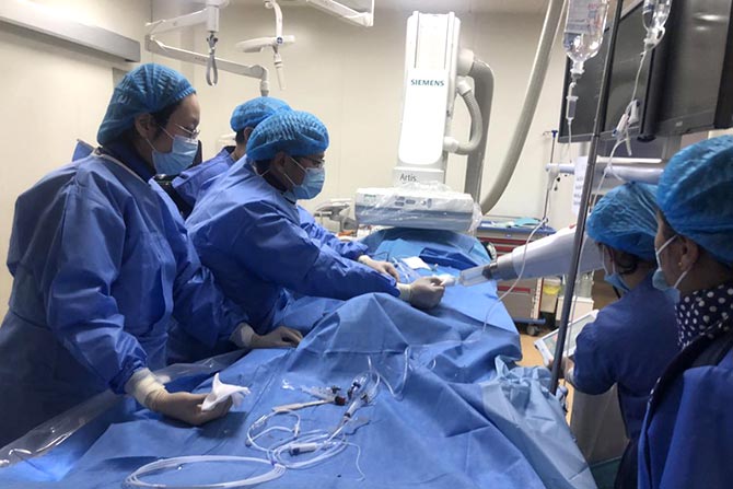开展的一台手术是一例因胸闷伴活动后气促就诊,心脏彩超检查发现有先天性心脏病,室间隔缺损(巨大膜部瘤形成)的患者。幸运的是,尚未合并肺动脉高压。当他了解到林芝市人民医院可以开展微创介入治疗,避免了外科开胸修补而可能的创伤、感染风险,又避免了去内地做手术过多的经济负担后,坚决要求在林芝市人民医院行介入封堵室间隔缺损。作为已经有相当介入治疗经验的两批组团援藏医疗人才谢兆丰、孙凌来说,这不过是一次常规例行手术。常规消毒麻醉、左右心导管检查,等到造影后大家发现,缺损基底有22mm,右室面破口达10mm,属于非常罕见的室间隔缺损,巨大膜部瘤形成。如果在内地,对于这种类型的室间隔缺损,介入封堵的成功率很小,或许外科手术是最佳手术方案,但全国著名结构性心脏病专家张智伟教授并未轻言放弃,顶着现有器械可能过小不能完全封堵缺损,甚至有封堵器脱落导致手术失败的风险,显示出了过人的能力及担当,历时两个多小时,带领大家先后使用12mm、14mm对称型室间隔缺损封堵器,但都因缺损太大,不能起到封堵效果,随后创造性地釆用10mm房间隔缺损封堵器,成功完成了林芝市人民医院第一例经皮巨大室间隔缺损封堵术。这是继经皮房间隔缺损封堵术后,林芝市人民医院再次勇于创新,填补了常见左向右分流型结构性心脏病林芝市介入治疗领域的又一空白。