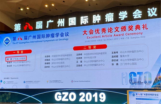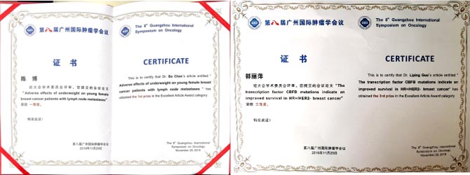 2019年11月29日至12月1日,由广东省抗癌协会、美中抗癌协会(USCACA)等联合主办的第八届广州国际肿瘤学会议(Guangzhou International Symposium on Oncology, GZO) 于广州白云国际会议中心隆重召开。本次大会共评选出优秀论文一等奖3篇,二等奖12篇,三等奖19篇。我院乳腺科廖宁教授团队2项研究成果入选本次大会。其中乳腺科陈博医师的论文“Adverse effects of underweight on young female breast cancer with lymph node metastases”荣获大会优秀论文一等奖,郭丽萍硕士研究生的论文“The transcription factor CBFB mutations indicate an improved survival in HR+/HER2- breast cancer”荣获大会优秀论文三等奖。
