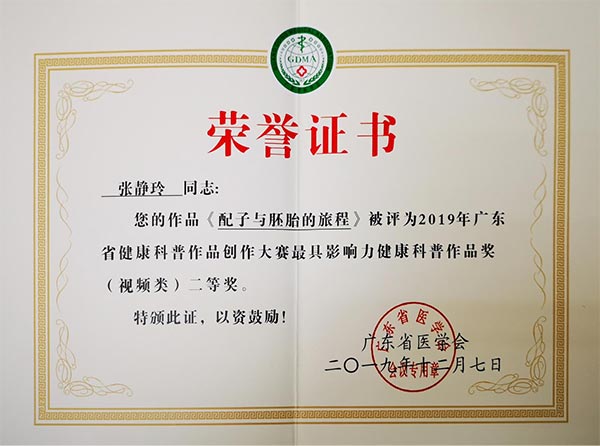 生殖医学中心张静玲的《配子与胚胎的旅程》获最具影响力健康科普作品奖(视频类)二等奖