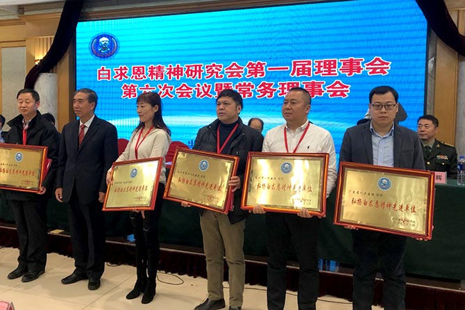 2019年12月21日,为纪念白求恩逝世80周年暨毛泽东同志发表《纪念白求恩》80周年,传承白求恩精神研讨会暨白求恩精神研究会第一届理事会第六次会议在河北石家庄召开,来自白求恩精神研究会、白求恩国际和平医院、北京大学、广东省人民医院等全国70多家单位近200人参会。会上,我院荣获“弘扬白求恩精神先进单位”荣誉称号,党委书记耿庆山增选为白求恩精神研究会第一届理事会理事。