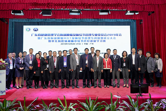 “广东省健康管理学会胸部肿瘤及肺结节管理专业委员会2019年会,暨广东省胸部肿瘤MDT及肺结节管理专科联盟成立大会暨单孔胸腔镜和肺小结节诊疗进展学习班”于2019年12月21日在广州举行,会议邀请了国内知名的胸外科专家及相关学科的专家作专题报告,针对胸部肿瘤及肺结节的最新诊断技术及其应用,从胸外科、呼吸科、肺部肿瘤科、影像科、病理分子诊断、体检科等多学科的不同角度对胸部肿瘤MDT及肺结节管理的最新进展等内容做专题报告。会议采用现场参会及网络直播的形式,线上线下与会人数达800多人次,会议不仅仅聚焦肺结节的热点问题,同时聚焦于胸部肿瘤MDT的新进展新发现,其间线上线下主持为整个会议进程增添了热烈讨论气氛。