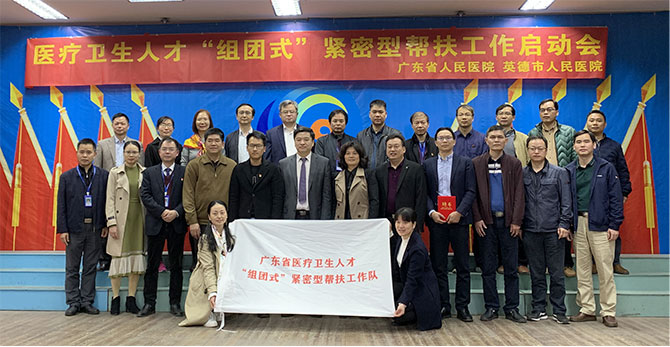 2018年开始,广东省卫生健康委开展了第一批医疗卫生人才“组团式”帮扶工作,选择14家整体水平较高、医疗资源集中的三甲公立医院作为支援医院,从粤东粤西粤北14个地级市中各选择一个水平相对较弱的县人民医院作为受援医院,双方结对展开“组团式”帮扶。为拓展“组团式”帮扶工作成果,今年扩大了帮扶医院数量,组织全省54家三甲公立医院帮扶78家县级公立医院。2019年12月17日,广东省卫生健康委举行全面开展医疗卫生人才“组团式”紧密型帮扶工作启动会,78支390人的“组团式”帮扶工作队正式到位。广东省卫生健康委党组书记、主任段宇飞出席并作动员讲话,他强调“县级医院是推进县域医共体建设的龙头,‘组团式’紧密型帮扶工作就是要把龙头强起来,带动其他基层医院”。争取到2021年,受援的78家县级公立医院医疗服务能力达到国家推荐标准要求,县域住院率提升至85%以上,基本实现大病不出县。