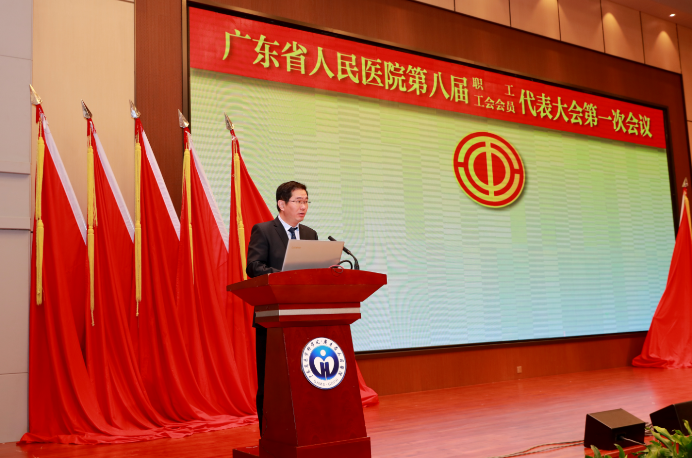 我院第八届职工代表、工会会员代表大会第一次会议于2020年1月16至17日在多功能厅隆重召开。耿庆山、余学清、何斌、严晋、徐力新、袁向东、林展翼、李欣、杨小红等全体院领导以及医院新一届的250多名职工、工会会员代表参加会议。省卫生健康委直属机关党委专职副书记、纪委书记、工会常务副主席汪洪滨出席会议并在会上宣读了对广东省人民医院工会委员会换届改选的批复。大会由工会邓南副主席、工会办公室谢锦绍主任主持。