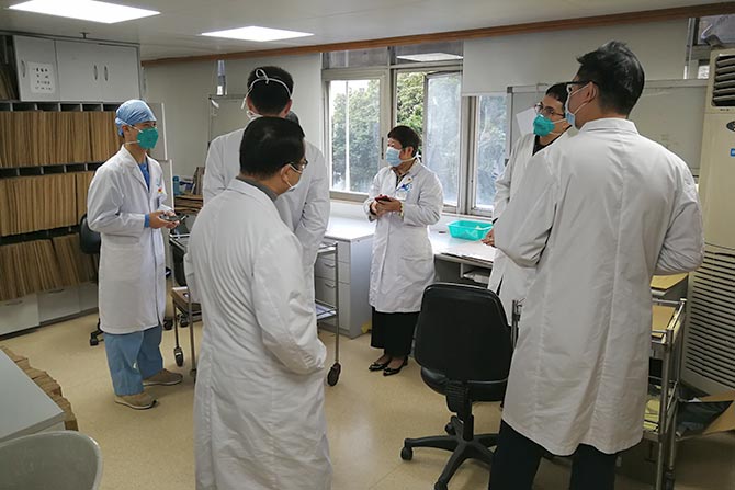 1月19日,科室所有同事参加交班会。交班会上,梁长虹主任强调所有同事务必高度重视,不能有丝毫疏忽。赵振军副主任详细介绍了放射科新型冠状病毒感染预防与控制指引(试行版),从X线普通照片/CT检查安排、放射科人员防护、检查室消毒、污物管理几个方面逐条梳理,制订防控措施。