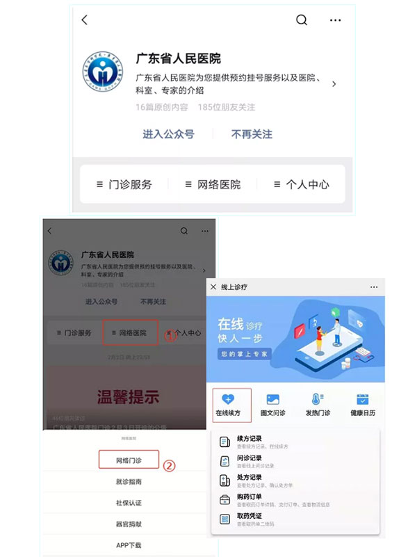 目前,已经推出高血压、糖尿病等常见慢性病网上续方服务,广州医保高血压糖尿病门特复诊续方通道也已开放,可搜索【广东省人民医院】微信服务号,关注后,通过网络医院→网络门诊,自助完成相关慢病续方建档。对于自费患者,还可以进行冠心病的续方。