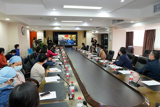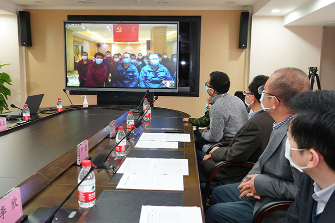 医疗队队长、临时党支部书记邓医宇代表医疗队向医院简要汇报了工作情况。他表示,医疗队队员们充分感受到了医院党委和全院同事们的关心和支持,目前理顺了对接病区的工作,救治工作越来越顺利。同时,现在队员防护物资也是充足的,大家情绪高昂,充满信心。“请医院放心,请组织放心,我们一定抗‘疫’到底!”