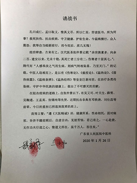 疫情就是命令!我院迅速行动,第一时间成立了领导小组、防治工作小组和新冠肺炎的临床救治专家组,并作了工作部署:除夕之夜派出了21位省医人参加了第一批广东赴湖北医疗队,还成立了以王昌俊主任为组长的“新冠肺炎防控中医专家组”,中医科林举择和兰小和两位党员主动请缨,写下了 “苦读医书,所谓何事?救死扶伤,抗击疾病,今温病横行,众人皆恐,我等自当砥砺前行”的“请战书”,展示了共产党员勇担时代使命的担当。