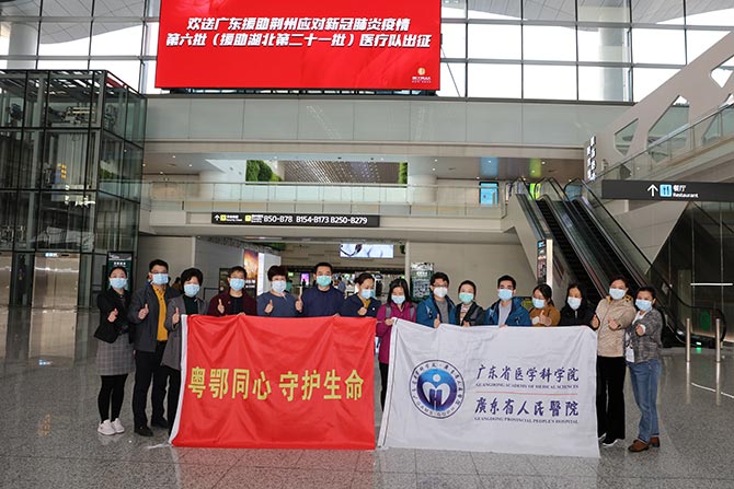 继省医急危重症医学部副主任蒋文新和骨干麦聪接到广东支持荆州指挥部的“直接急召令”紧急驰援湖北后,20号中午,省医ICU又收到指挥部“战场点将令”。经过两个小时的准备时间后,东病区ICU黄道政副主任医师、主治医师王中华和护士长廖游玩、ICU二区护士长陈丽芳4位“重症救治主力干将”直奔机场赴荆州支援。他们6人将组成战队进行团体战疫,全力救治荆州的重症、危重症病人。