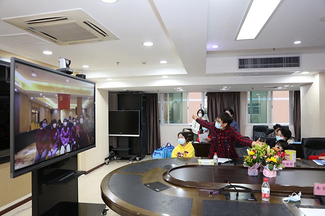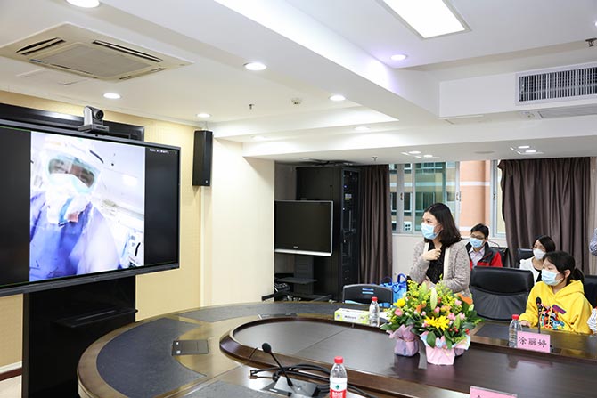 春节前,一场突如起来的新冠肺炎疫情打破了新年团圆的祥和,也吹响了医护人员的集结号。战“疫”打响以后,省医“全院一盘棋”,全体医务人员团结一心、迎难而上,在医院、武汉、荆州、深圳、中山和对口援助单位等各个战场上,打响了一场场阻击战,捍卫人民健康。作为省属龙头医院,省医陆续派出9批“精兵强将”40名医护人员,他们在前线枕戈待旦,誓战胜而还,却也成为医院大后方最大的牵挂。适逢国际三八妇女节110周年,3月6日下午,医院委托院妇委会和女工委,组织了一场特殊的远程视频慰问活动。院长余学清、党委副书记何斌、纪委书记严晋、副院长袁向东、部分职能处室和科室负责人、10名队员在穗家属代表一起,通过网络,跨越时空,把组织的关心、家人的思念以及对女同胞的节日祝福凝聚传递给前方队员。会议由杨小红副院长主持。