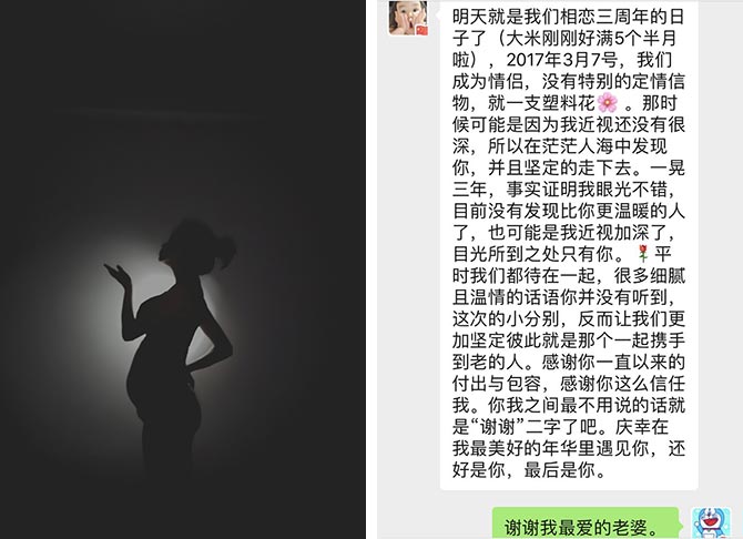 回想2月14日那天,我错过和老婆的结婚纪念日。今天,女神节的3月7日,也错过了我和她相爱三周年纪念日,她并没有抱怨我,反而更加支持我的工作,每每这时都会觉得自己很幸运、很幸福。有妻如此,夫复何求!今年的我,千里之外,无法准备礼物给她,心里总是有点儿愧疚,但也是经过这次的分别让我们更珍惜对方!还有我们的大米,今天刚刚好满5个半月啦,当TA在她肚子里打嗝、拳打脚踢的时候,我也好想隔着皮肤,摸一摸TA,感受一下这个神奇的小生命,顺便刷刷存在感……