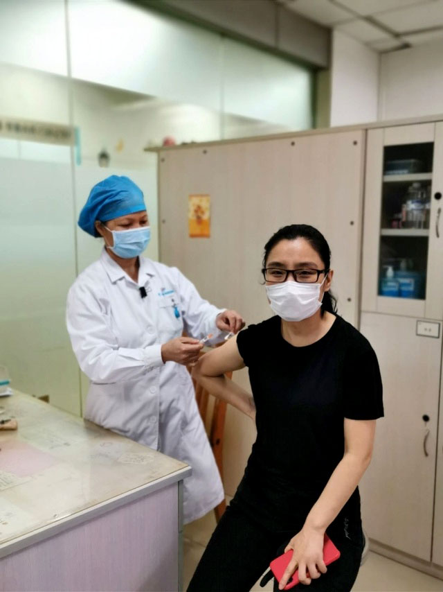 广东省人民医院心理科主任侯彩兰在出发前接受提升免疫力的针剂注射。