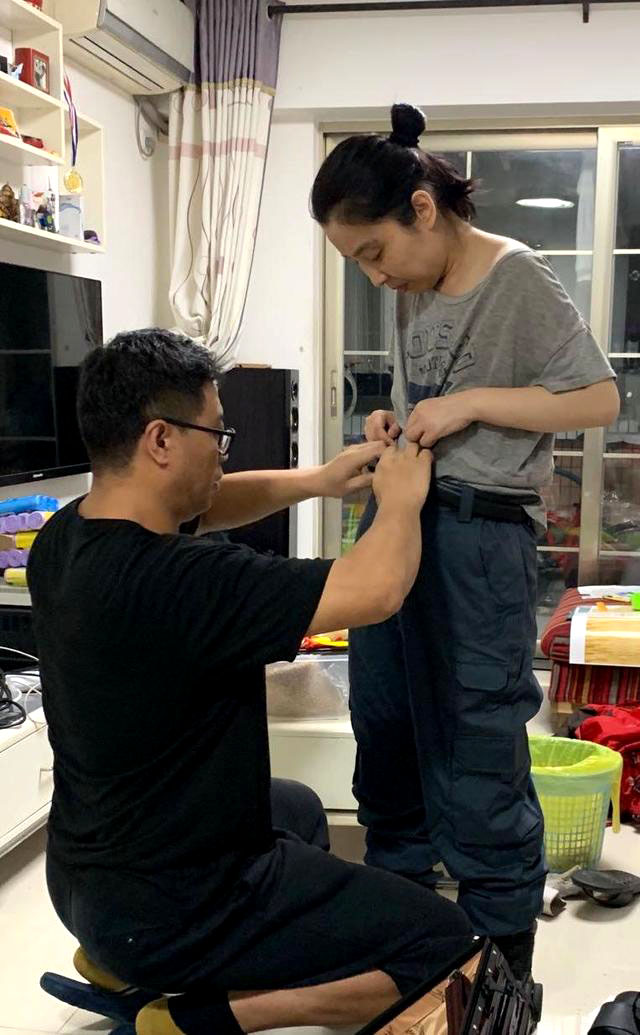 侯彩兰主任的丈夫也是医务人员,妻子出发前他心细的为她整理衣服,叮嘱太太做好防护。
