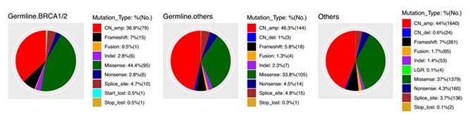 本研究还发现不同胚系突变人群,其体系突变谱也存在差异性,BRCA1/2胚系突变组较其它非BRCA胚系突变组检出更多的错义突变 (P=0.02)和更少拷贝数扩增事件 (P=0.04)。而其它非BRCA胚系突变组与不携带遗传易感基因组无显著差异(图2)。不同组中的高频基因突变也不尽相同,提示潜在的生物学意义也不尽相同。