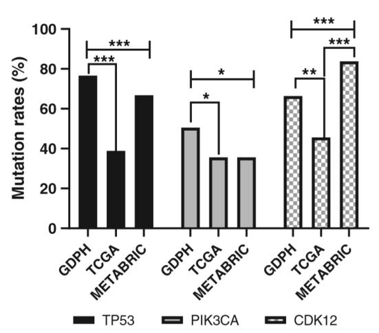 图3. 通过数据库比较TP53, PIK3CA和CDK12在HER2阳性乳腺癌中的突变频率。