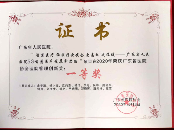 据悉,此次医院管理创新奖评选,是经单位(团队)申报、各地市医院协(学)会推荐、资格审核、专家评审及公示等严格程序,评委会共选出2020年广东省医院协会医院管理创新一等奖3项、二等奖5项、三等奖11项。我院作为首家政府主导的5G应用示范医院,将本着求真务实、勇于创新、实现突破的精神,继续致力智慧医院建设、以信息建设助力医院管理,努力让医疗更安全更高效更温暖!
