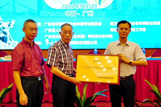李梓廉副局长(右)向黄松柏省名中医传承工作室授牌
