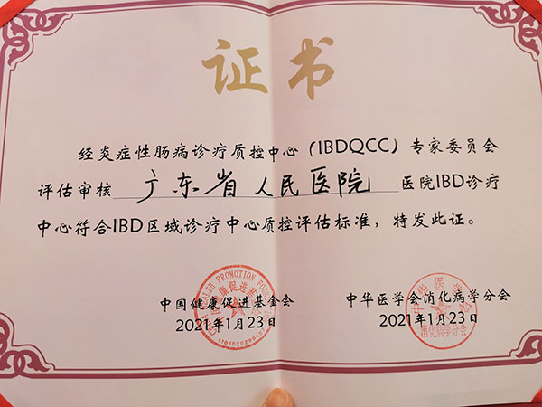 2021年1月23日,由中华医学会消化病学分会、中国健康促进基金会主办的炎症性肠病(IBD)质控管理高峰论坛在广州举行,我院消化内科IBD中心通过专家投票评审,被认定为IBD区域诊疗中心!大会主席、中华医学会消化病学分会主任委员、中山大学附属第一医院副院长、消化内科首席专家陈旻湖教授为沙卫红主任颁发证书。沙卫红主任在会上表示,我院IBD中心达到区域中心的评估标准,是我院消化内科及多学科诊疗团队(MDT)专家、兄弟科室同事多年来共同努力的结果,是医院所提供大平台优势的体现,消化内科将继续借助IBD区域中心的影响力,诊疗范围辐射华南甚至全国。会后,消化内科布小玲主任、马娟主任、廖山婴主任、张庆芳主任、岑荣英主任、姚远涛主任、王蓓蓓主治医师、张华娟护士长、宋希护理组长等IBD团队成员表示将继续做好IBD临床工作,争取为更多IBD患者尤其是复杂瘘管、肠外病变案例提供更加优质的医疗服务。