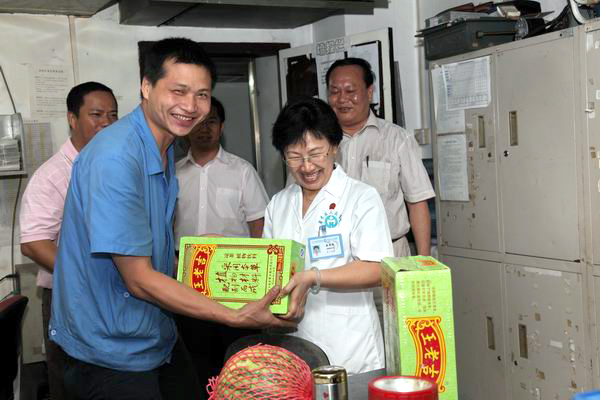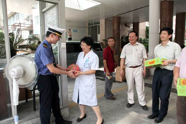 进入7月以来,广州高温、酷热的天气持续了多日,院领导非常关心在高温一线工作的员工。7月7日上午,由党委副书记崔建星带队,工会、党办、人事、总务等多个部门领导一起前往膳食科、输送科、机电维修科和保卫科等高温作业的基层一线职工送上凉茶和水果,为他们降温、解暑。基层一线职工们从崔书记手中接过清凉饮料和水果时,脸带笑容感谢院领导的爱护之心,就连周围的就医者见到了,也情不自禁地竖起大拇指。