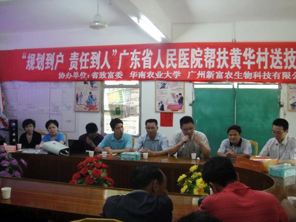 为更好的开展“规划到户责任到人”活动,8月20日我院联合省致富委、华南农业大学、广州新富农生物科技有限公司的农业专家冒着酷暑前往黄华村开展送农业技术下乡活动。此次活动由院扶贫办主任佘天德主持,医院党总支陈泽萍和吕惠敏书记、省致富委周国胜秘书长、新富农生物科技有限公司胡平湘总经理、惠东县平海镇人民政府农业技术推广站张倍康站长、省卫生厅驻村工作组谢锦绍、周江镇陈春宣副镇长等相关干部群众共100多人参加。