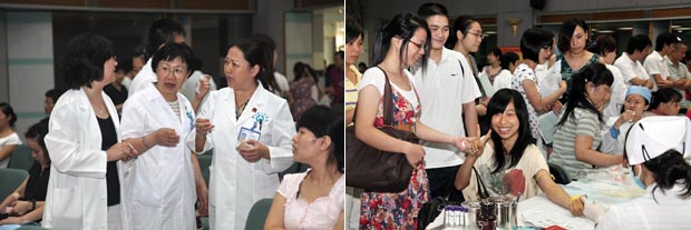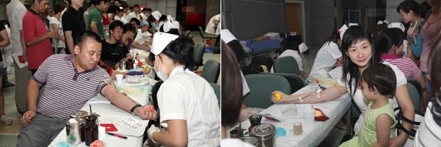 待到献血当天,原本通知献血上午8:30开始,8点就已经有一些人早早地到多功能厅等候。有的人下了夜班就直接赶来,有的人刚下手术台就赶过来,有的人正出门诊看着病人少些抽点时间赶过来。接近9点钟时,整个多功能厅人群簇拥,人们一边排队录入身份证,一边做简单快速的血型和血检,一边手持血型条码卡等候献血。献血紧张而又有序地进行。由于前来献血的人实在太多,很多人只得先在旁边候着,有的竟加入志愿者行列,帮助维护秩序和协助工作人员。