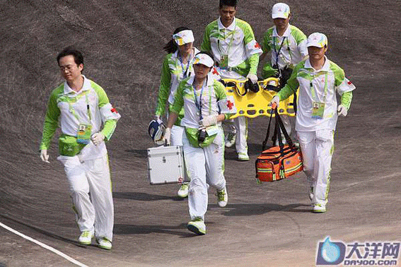 导读:场地自行车比赛是一项风险指数较高的项目,在11月16日的女子记分赛以及11月17的男子凯琳赛中,接连发生了碰撞事故,当场边的观众还没反映过来的时候,一群身穿青绿色队服,挂着“红十字”袖章的医疗卫生志愿队就已经进入赛场,并有条不紊地对受伤的运动员展开救治,从而保障了余下的比赛能继续进行。