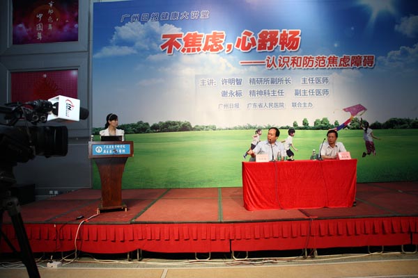 昨天上午,广州日报“健康大讲堂”携手我院省精神卫生研究所,在主体楼门诊四楼多功能厅举行了“不焦虑,心舒畅——认识和防范焦虑障碍”专题大型讲座。广东省精神卫生研究所副所长许明智与精神科主任谢永标对“焦虑”进行了深入浅出、生动易懂的讲解,三百人的会场人头涌涌,现场气氛十分热烈。