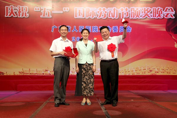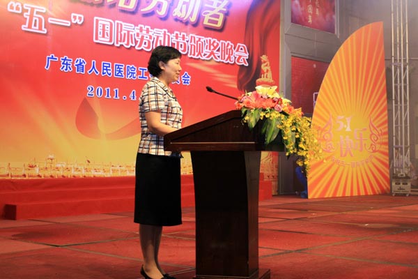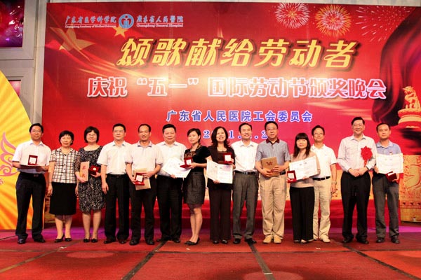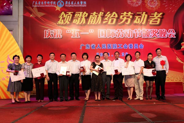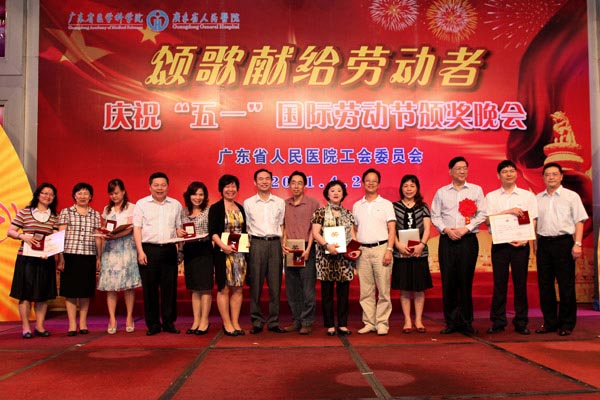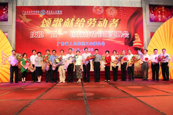 2011年4月28日晚,由院工会主办的“颂歌献给劳动者”——广东省人民医院庆祝五一国际劳动节颁奖晚会在我院多功能厅隆重举行。我院历年来获得省级以上劳模、五一劳动奖章及2010年忠诚服务奖获得者;省直属机关工会工作委员会主席程莉莉、助理调研员秦丽丽、科长周志鹏、科长楚文元;省卫生厅工会副主席宋吉敏;医院林曙光院长、院党委书记曾国洪、副院长庄建、副院长吴一龙、院党委副书记、院工会主席崔建星、副院长何斌、院纪委书记张念樵、院工会专职副主席邓南等领导出席了晚会,与广大职工欢聚一堂,共同庆祝即将到来的“五一”国际劳动节。
