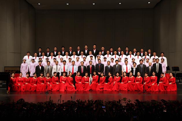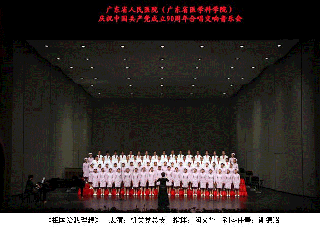 “鲜红的太阳给我希望,奔腾的江河给我力量,浩荡的春风给我温暖,亲爱的祖国给我理想!”一曲抒情的《祖国给我理想》拉开了整晚表演的序幕。在广州大剧院华丽宏伟的音乐殿堂里,来自我院的9个党总支分别为观众献上了9首熟悉的革命歌曲。《松花江上》把观众们带回到解放前国破家亡的苦难年代,《娘子军连歌》激昂的旋律激荡起观众爱国救国的热情,《跟着共产党走》、《把一切献给党》表达了中国人民90年风雨历程从贫穷走向富裕中对党的敬仰和忠诚。专业的指挥,华美的演出服,时而深情、时而高昂的歌声,一次又一次地掀起现场观众的激情,将现场的气氛不断推向高潮。