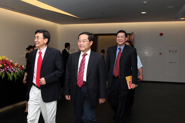 林曙光院长陪同罗东凯书记(中)、姚志彬厅长(左)步入剧院大厅