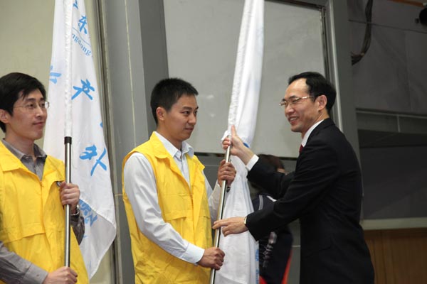 随后,庄建院长为新成立的七支志愿者分队进行了授旗,并与志愿者们亲切合影。这是继05年建立共产主义志愿者队以来,我院第二次进行的志愿分队授旗仪式,从此我院志愿者分队形成“一支十叶”的格局,为实践志愿服务常态化打下了坚实的基础。