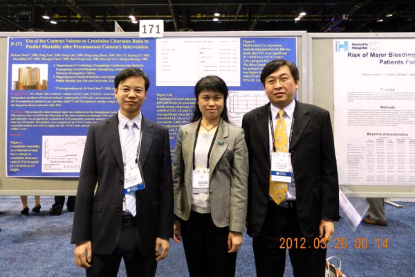 参会期间,陈纪言医生研究团队的论文《Use of the Contrast Volume to Creatinine Clearance Ratio to Predict Mortality after Percutaneous Coronary Intervention 》做了壁报展示,该论文前瞻性观察了1000多例行PCI(经皮冠状动脉介入)患者术后肾功能变化及临床预后,研究发现PCI术用造影剂剂量/肌酐清除率比值不仅对造影剂肾病(CIN)具有预测价值,而且对临床预后(死亡)也具有预测价值,为高危患者术前估算造影剂相对安全剂量提供了新的临床证据,并与参会代表就研究内容做了深入的交流,受到国际同行的推崇与肯定。