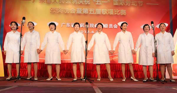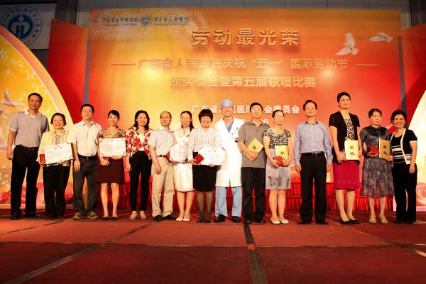 4月26日晚,多功能厅张灯结彩,人声沸腾,洋溢着一片节日的欢乐景象。“广东省人民医院庆祝五一国际劳动节颁奖晚会暨第五届歌唱比赛决赛”在这里隆重举办。省总工会张国兴副主席、孔祥鸿副主席、组织部宋杰部长、宣教部宋善斌部长、南方工报陈宝平社长,省直属机关工会工作委员会赵欣副主席、楚文元科长、林本菁、张婉娜,省卫生厅工会的何蕙泾,院领导庄建院长、曾国洪书记、王启仪副院长、张念樵书记、徐力新副院长、袁向东副院长,以及医院各职能处室领导、总支书记、片工会主席、2011年忠诚服务奖获得者等500多人参加了晚会。