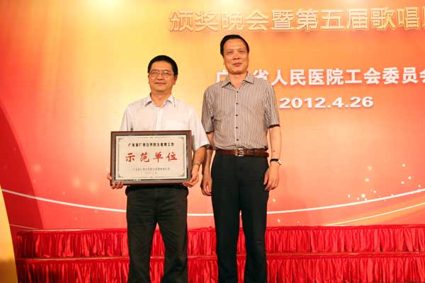 省总工会张国兴副主席为我院工会颁发“广东省五一劳动奖状”、“模范职工之家”、“全国优秀职工书屋示范点”奖,我院庄建院长、曾国洪书记、王启仪副院长代表医院领奖;省总工会的孔祥鸿副主席为我院颁发了“广东省首批省级厂务分开民主管理示范单位”牌匾,由院纪委书记张念樵代表医院受牌,孔祥鸿副主席还为尹东明主任颁发“全国卫生系统职工职业道德建设标兵”证书;省直机关工会赵欣副主席为工会办公室主任谢锦绍颁发省直机关“优秀工会积极分子”证书。