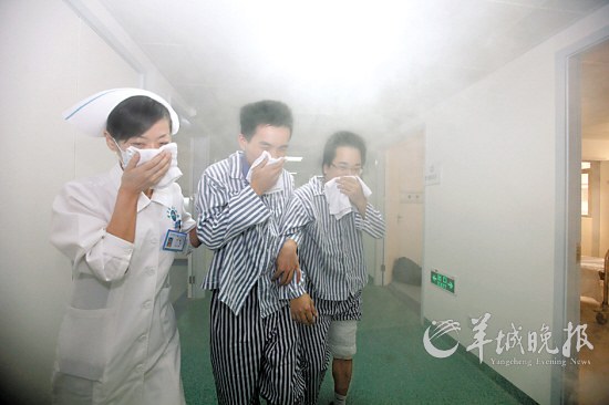 羊城晚报讯 记者夏杨,通讯员郝黎、张丹娜报道:浓烟滚滚,警笛刺耳,医护人员搀扶病人紧急疏散!昨日下午,在楼下经过的病人和家属以为广东省人民医院骨科病房真的出事了,其实这是医院开展消防实战演习。