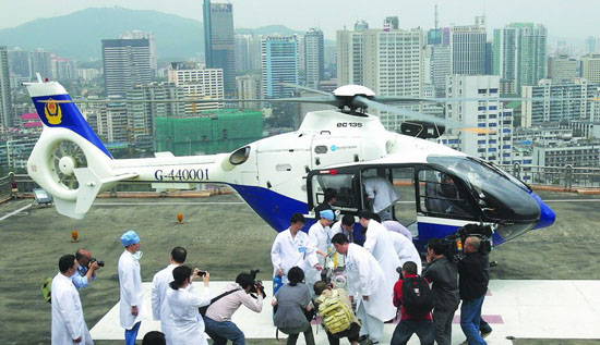 3月29日,一名先天性心脏病患儿由直升机载着从汕头飞至广州进行手术治疗。