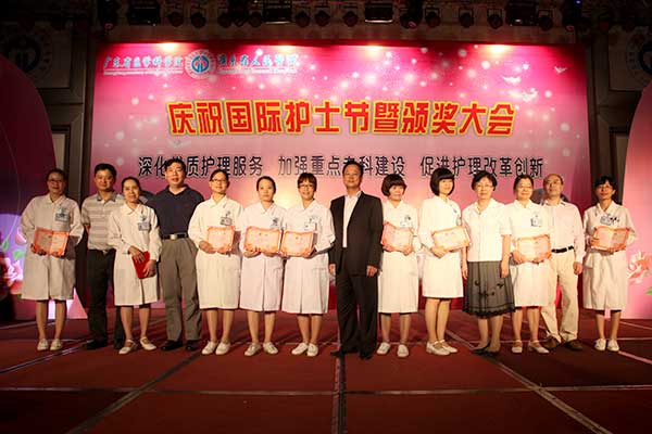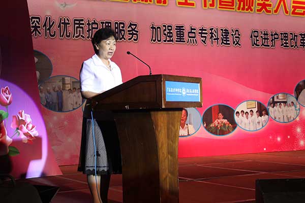 崔建星副书记宣读了 “2012年广州市红十字会第八届南丁格尔式优秀护士”的文件并为我院获此荣誉的老研所卢少萍科护士长进行了颁奖。大会还对获得优秀护士、优秀管理者、爱心护士等奖项的科室及个人进行了表彰,共有20个护理单元、214名护士获得了奖励。