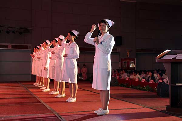 在乐曲声中,进行了庄严的授帽仪式,8名退休护士老前辈为8名新护士授帽。新护士们戴上圣洁的燕尾帽,站在南丁格尔的像前,庄严宣誓:以真心、爱心、责任心对待每一位病人;牢记今天的誓言,学习护理前辈忘我奉献的精神,延续护理事业,把毕生精力献给护理事业。