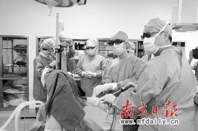 医生们齐刷刷佩戴“墨镜”,手术室里仿佛在拍特警大片,屏幕上还播放着高清3D影像,这不是电影,而是省人民医院胸外科手术室里的真实情况——医生们正利用最新的3D腔镜技术,对肺癌患者行肺叶切除术。昨日,笔者了解到,从6月27日至发稿时,该院已开展过十台3D腔镜手术,微创切口仅3-4cm,患者术后恢复良好,4到7天即可出院。