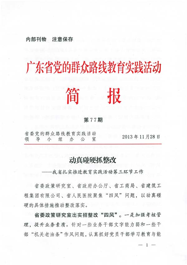 日前,省委印发党的群众路线教育实践活动第77期简报,以《动真碰硬抓整改》为题,报道了我省扎实推进教育实践活动第三环节工作。其中对我院聚焦“四风”问题,突出服务抓整改落实做了详实报道。