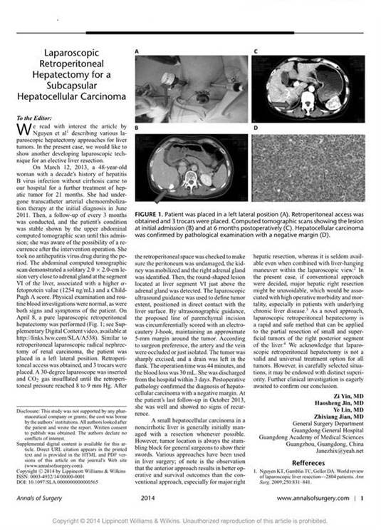 新春伊始,我院普通外科传来喜讯,简志祥主任的世界首例完全经后腹膜腹腔镜肝切除术在Annals of Suregry收录发表。