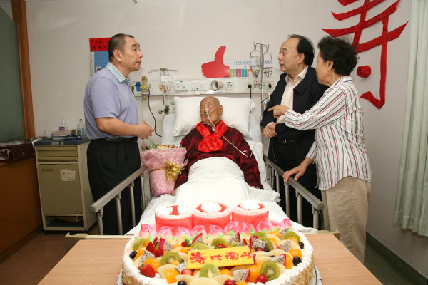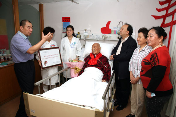 3月28日,普通而特殊。几年来已被下过十几次病危通知书的革命老人马皓,在我院东病区综合一区迎来了他的百岁寿诞。医务人员和家属们共同欢乐庆祝,我院党委书记耿庆山前往祝寿看望,赞扬马老为中国革命、建设和改革事业作出的不可磨灭的贡献。
