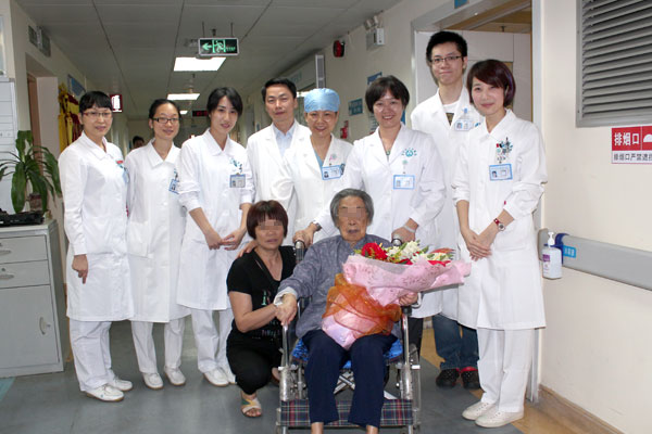 那是在2009年,当时94岁的黎婆婆在家发现连端坐都无力,家人情急下打120将其送到我院心内一区。当时任心内一区病区主任林纯莹发现黎婆婆患有高血压、心房颤动,急性心衰的表现,立即组织抢救,一个星期后,黎婆婆转危为安。当时林主任鼓励黎婆婆:“婆婆,你一定能活到一百岁,当您一百岁时,我们为您庆生!”