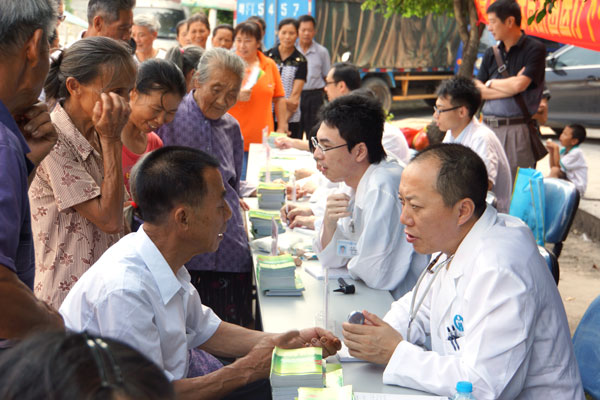 稻田里逐渐铺满了金黄色,农民正等待收割的丰收。第三天上午,我们来到了素有“粤北粮仓”之称的廊田镇义诊现场。恰逢该镇的墟日,听说是省城的医生来义诊,前来咨询的群众排起了长龙。“我这样的病情应该怎么办啊,要吃什么药?”医疗专家们顶着烈日,挥汗如雨,耐心细致地接待每一位问诊的群众,详细询问病人的病情,并根据实际情况为患者诊治开具药方,现场共接受咨询患者300多人。特别是面对老人时,不仅需要耐心讲解,语言不通时还得马上“搬救兵”翻译。从9时开始,义诊队一直忙到12点才结束。