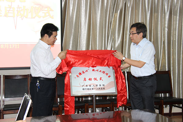 提议得到了喀地一院的积极响应,经过紧张有序的筹备,“粤疆连心”救心项目于8月17日启动,启动仪式上,凯赛尔书记等院领导对我院心内科大力支持援疆工作表示感谢,并与陈纪言主任共同为“粤疆连心”救心项目揭牌,宣布“粤疆连心”救心项目顺利启动!