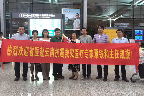 覃铁和所长出色完成了各项工作任务,为降低地震伤员的死亡率和致残率作出了积极的贡献,受到了各级领导和当地同行及伤员的高度评价。8月23日22时30分,覃铁和所长从震区顺利返回广州,受到医院党委崔建星副书记一行的迎接。